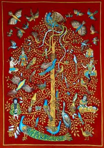 Arbre et oiseaux fond rouge 2-C4 (103×73) – Kalamkari