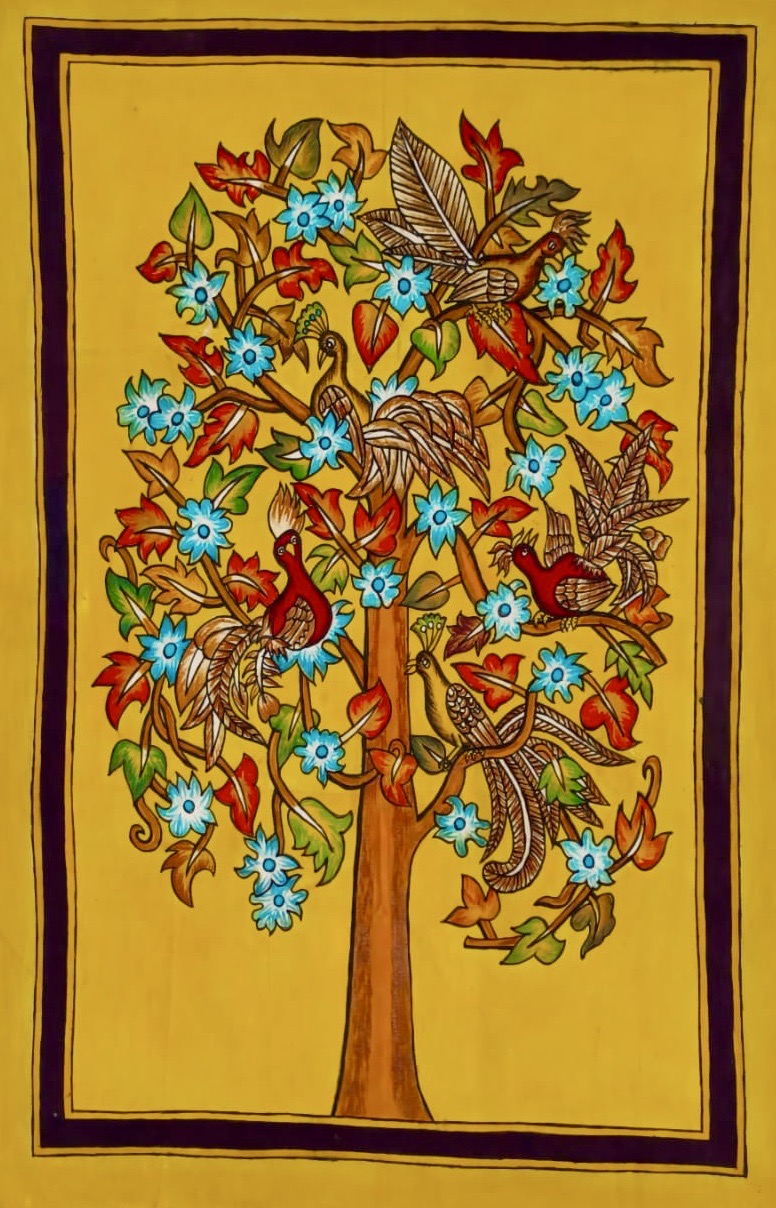 Il signifie la plume (de roseau) à la main. Cet art ancestral est transmis de femmes en femmes en Inde. Elles peignent à la main avec des teintures végétales sur de la toile en coton. C’est un travail très minutieux qui nécessite du temps.