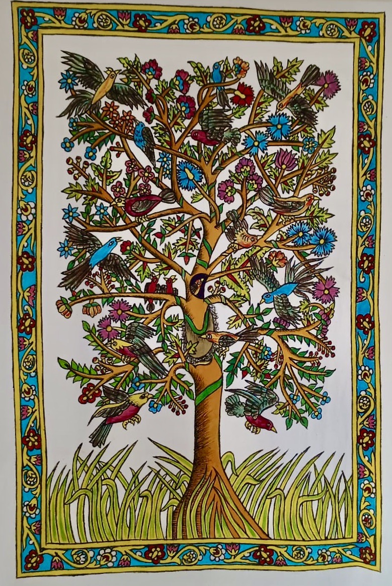 Il signifie la plume (de roseau) à la main. Cet art ancestral est transmis de femmes en femmes en Inde. Elles peignent à la main avec des teintures végétales sur de la toile en coton. C’est un travail très minutieux qui nécessite du temps.