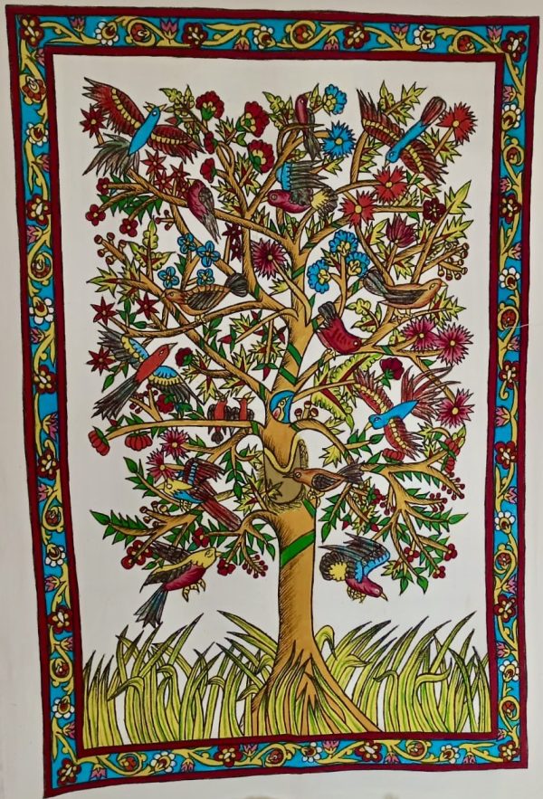 Il signifie la plume (de roseau) à la main. Cet art ancestral est transmis de femmes en femmes en Inde. Elles peignent à la main avec des teintures végétales sur de la toile en coton. C’est un travail très minutieux qui nécessite du temps.