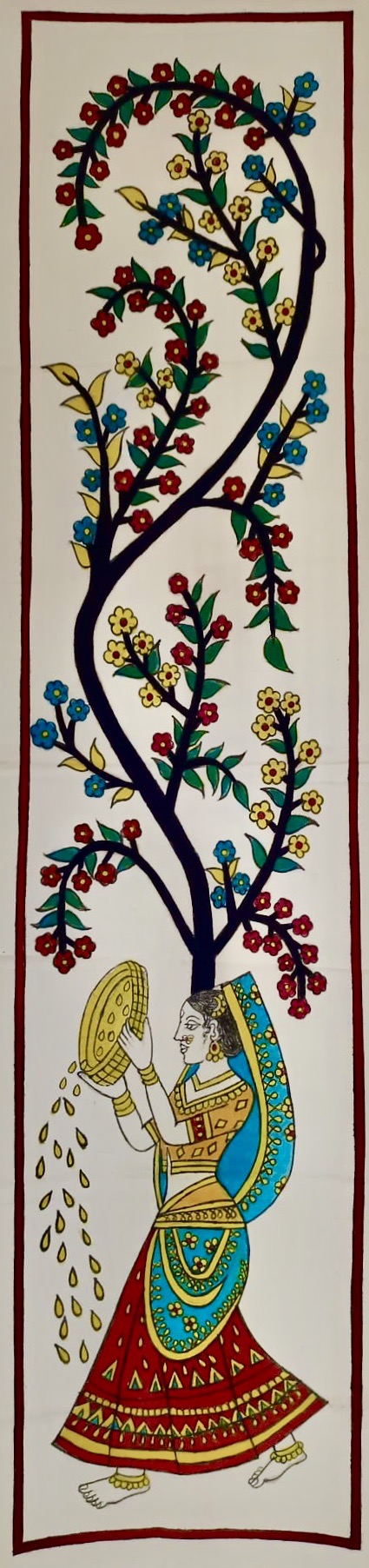 Il signifie la plume (de roseau) à la main. Cet art ancestral est transmis de femmes en femmes en Inde. Elles peignent à la main avec des teintures végétales sur de la toile en coton. C’est un travail très minutieux qui nécessite du temps.