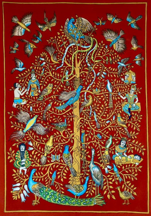Accueil / Produits / Arbre et oiseaux fond rouge 2-C4 (103×73) – Kalamkari