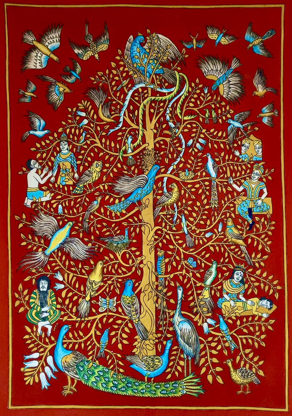 Arbre et oiseaux fond rouge 2-C4 (103×73) – Kalamkari