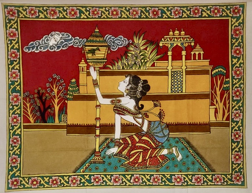 Accueil / Produits / Femme et oiseau F12 (91×70) – Kalamkari