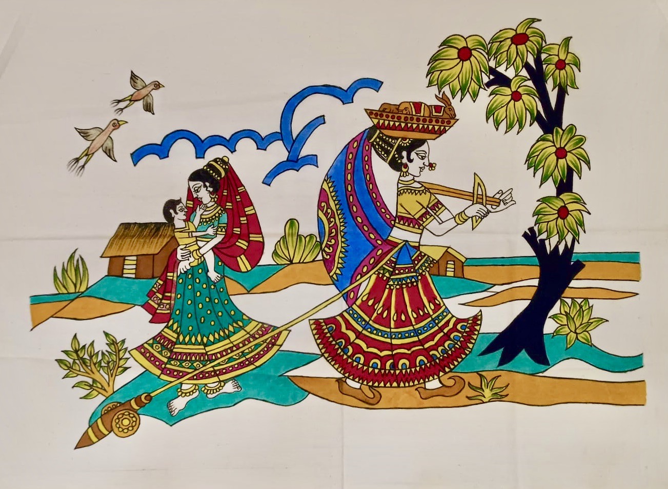 Il est aussi intimement lié au temps de lavage et de séchage, et ceci est valable pour chaque couleur ajoutée sur le tissu. Plus le dessin initial est détaillé et complexe, plus l’aboutissement final s’allonge. Les kalamkari peuvent représenter à la fois des scènes mythiques recueillies dans les Véda tout comme des passages de la vie quotidienne indienne.