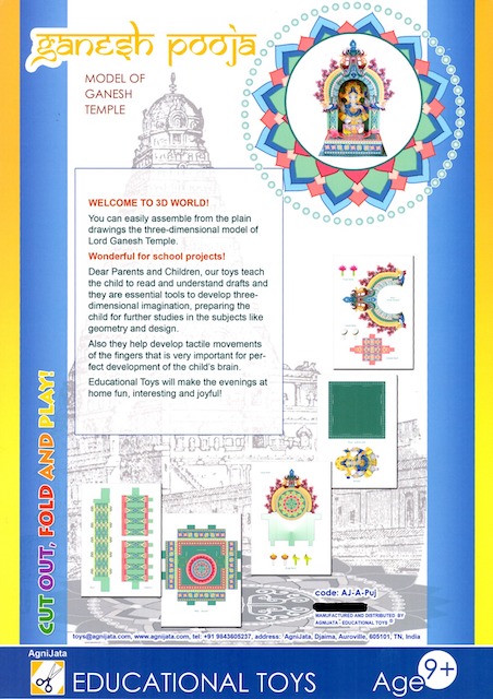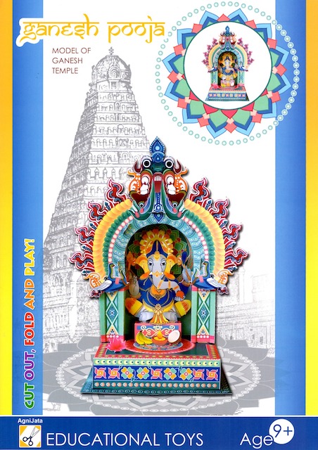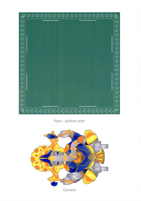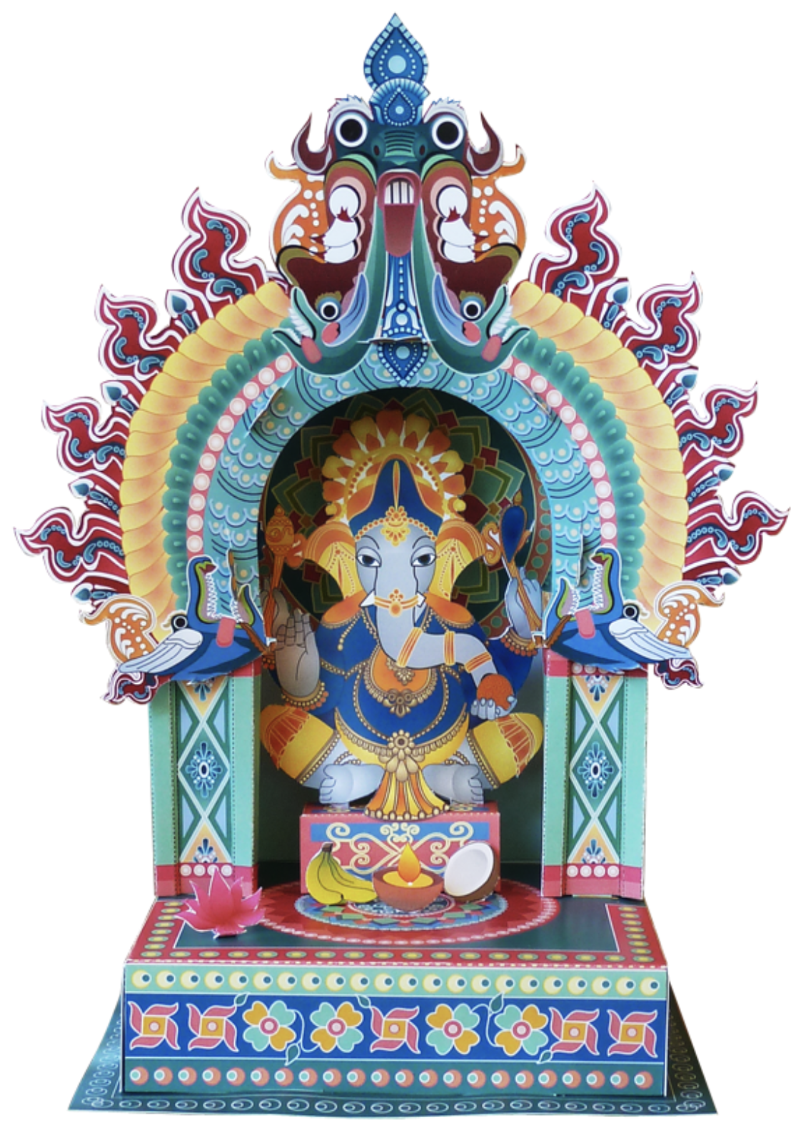 Pour réaliser le Temple de Ganesh, vous n’aurez besoin que de ciseaux et d’un coupe-papier : découpez les détails, incisez les lignes épaisses avec le coupe-papier, pliez les détails sur les lignes pointillées et assemblez les parties d’un temple en suivant les instructions, découpez Ganesha et placez-le à l’intérieur du Temple, placez les objets de pooja devant lui.