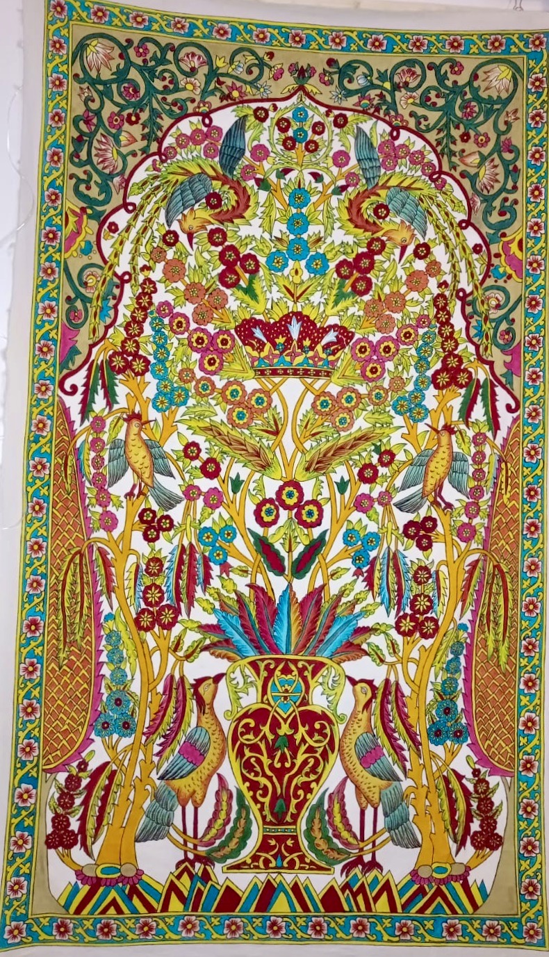 Il signifie la plume (de roseau) à la main. Cet art ancestral est transmis de femmes en femmes en Inde. Elles peignent à la main avec des teintures végétales sur de la toile en coton. C’est un travail très minutieux qui nécessite du temps.