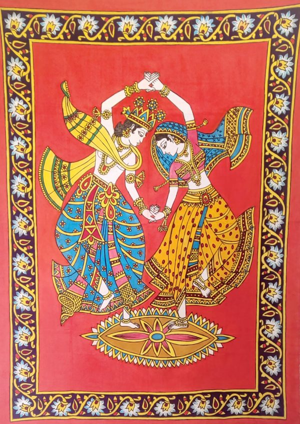 Accueil / Produits / Krishna et Radha fond rouge K14 (73×52) – Kalamkari