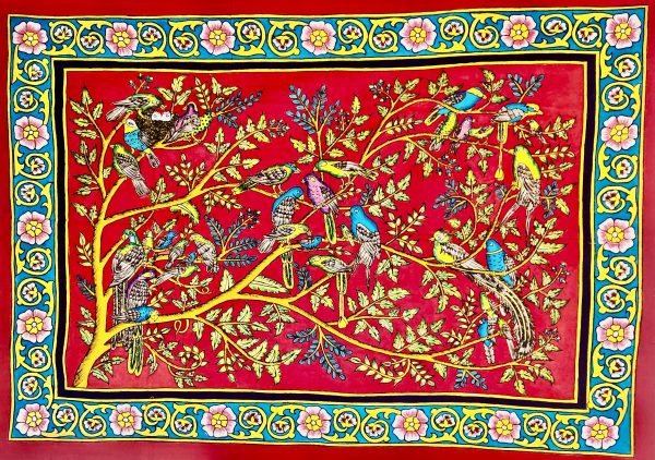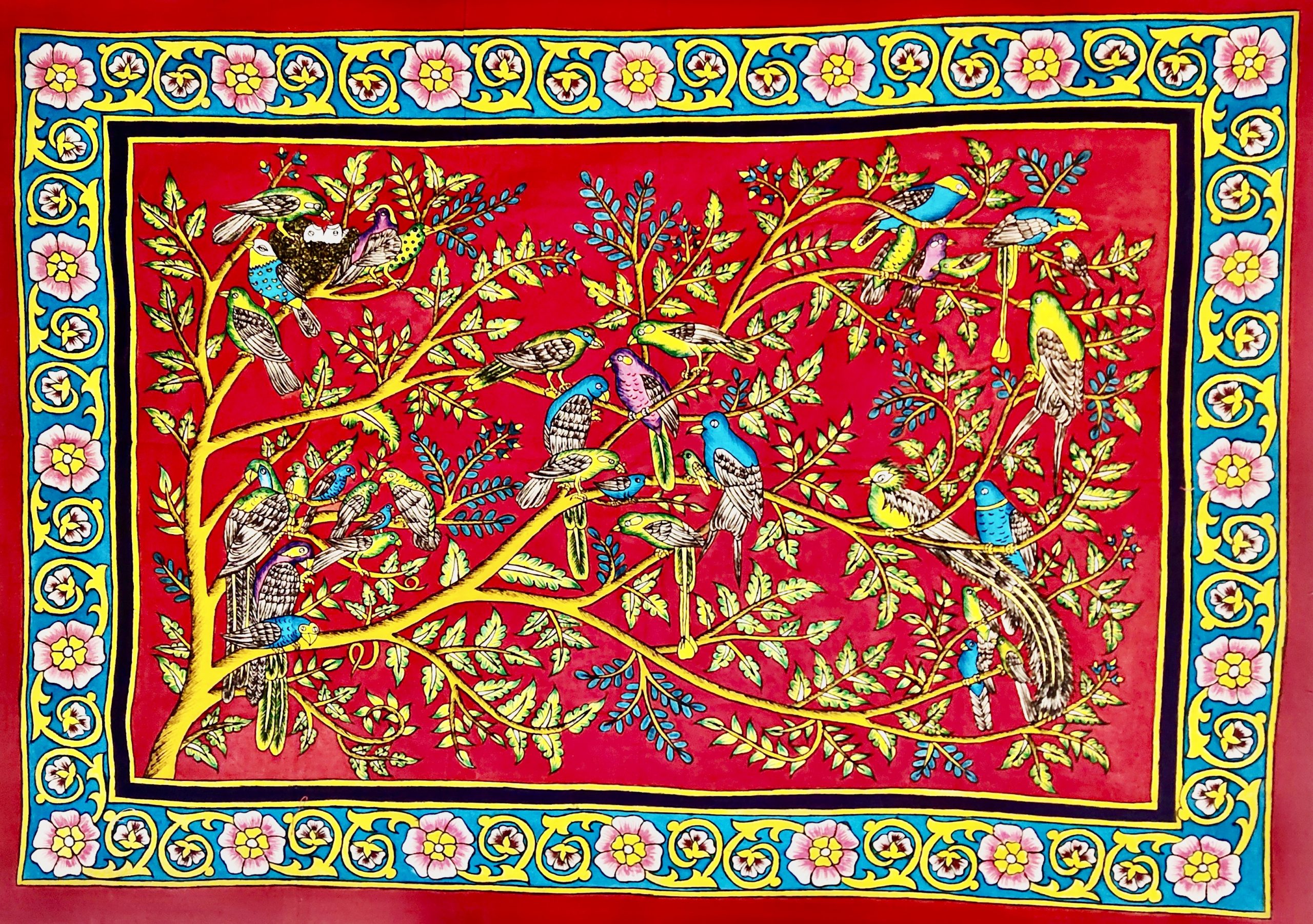Accueil / Produits / Oiseaux, arbre fond rouge C17 (136×96) – Kalamkari