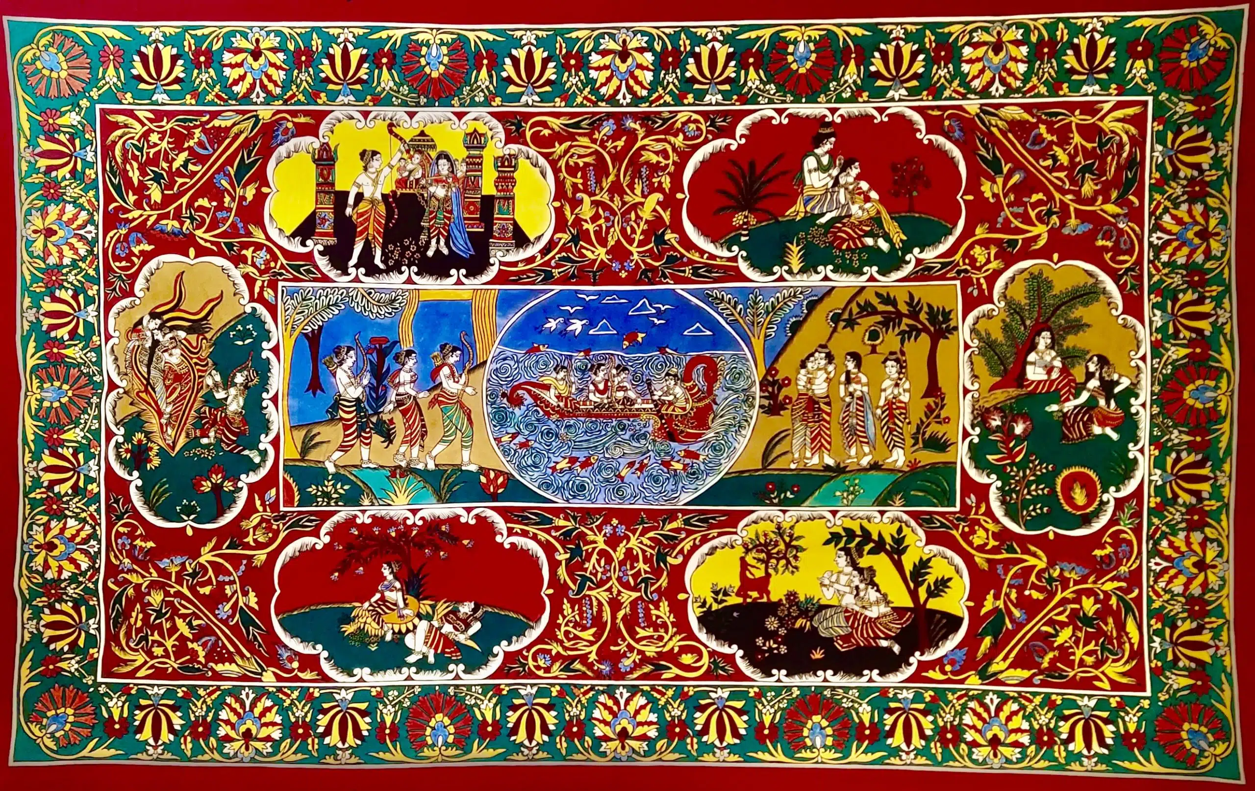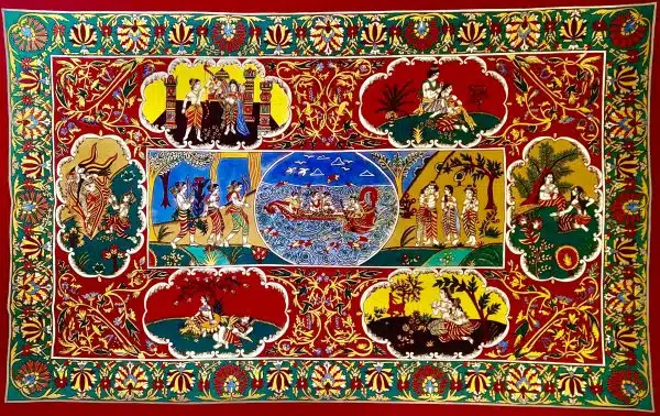 Il est aussi intimement lié au temps de lavage et de séchage, et ceci est valable pour chaque couleur ajoutée sur le tissu. Plus le dessin initial est détaillé et complexe, plus l’aboutissement final s’allonge. Les kalamkari peuvent représenter à la fois des scènes mythiques recueillies dans les Véda tout comme des passages de la vie quotidienne indienne.